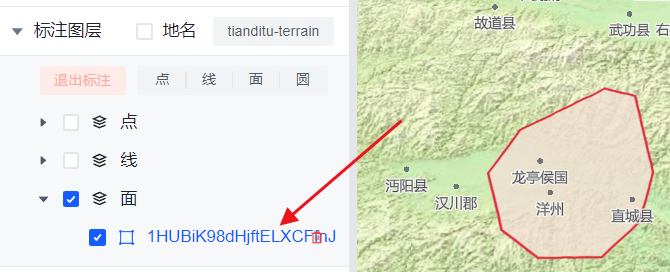 面和圆:用户点击以后,就可以在地图上绘制多边形和圆,双击结束绘制。
