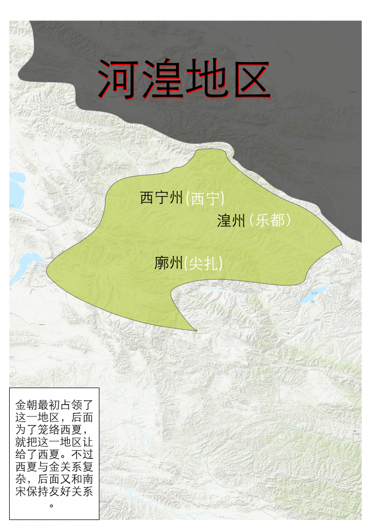 这一地区本来是由吐蕃唃厮啰政权占领的,徽宗时期夺取了这一地区。西夏趁北宋灭亡时占领了这一地区。西夏并没有夺得兰州,这倒是挺意外的,可能金朝觉得这里也很重要,就没有让给西夏。