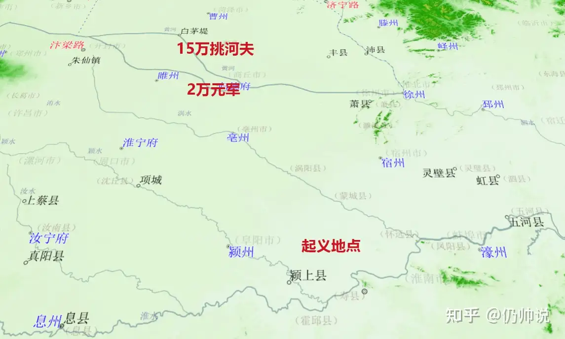 从地图上也可以看出,刘福通起事的地点离黄河还有段距离,活动范围也是向西发展,这说明他有意避开了两万官军驻守的河道区域。